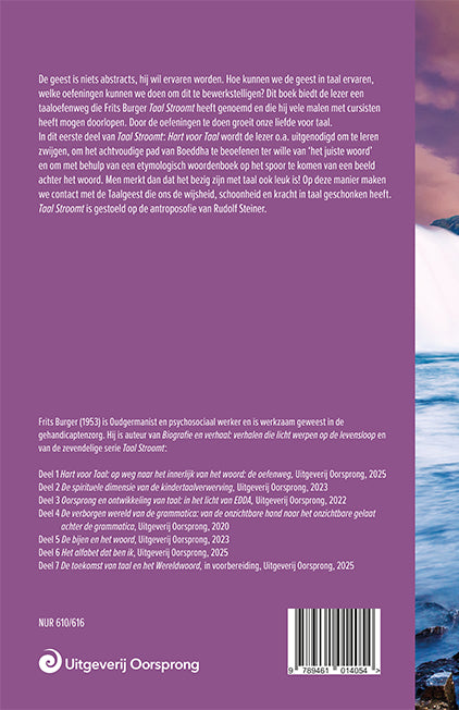 De geest is niets abstracts, hij wil ervaren worden. Hoe kunnen we de geest in taal ervaren, welke oefeningen kunnen we doen om dit te bewerkstelligen? Dit boek biedt de lezer een taaloefenweg die Frits Burger Taal Stroomt heeft genoemd en die hij vele malen met cursisten heeft mogen doorlopen. Door de oefeningen te doen groeit onze liefde voor taal. In dit eerste deel van Taal Stroomt: Hart voor Taal wordt de lezer o.a. uitgenodigd om te leren zwijgen, om het achtvoudige pad van Boeddha te beoefenen ter wille van ‘het juiste woord’en om met behulp van een etymologisch woordenboek op het spoor te komen van een beeld achter het woord. Men merkt dan dat het bezig zijn met taal ook leuk is! Op deze manier maken we contact met de Taalgeest die ons de wijsheid, schoonheid en kracht in taal geschonken heeft. Taal Stroomt is gestoeld op de antroposofie van Rudolf Steiner.
